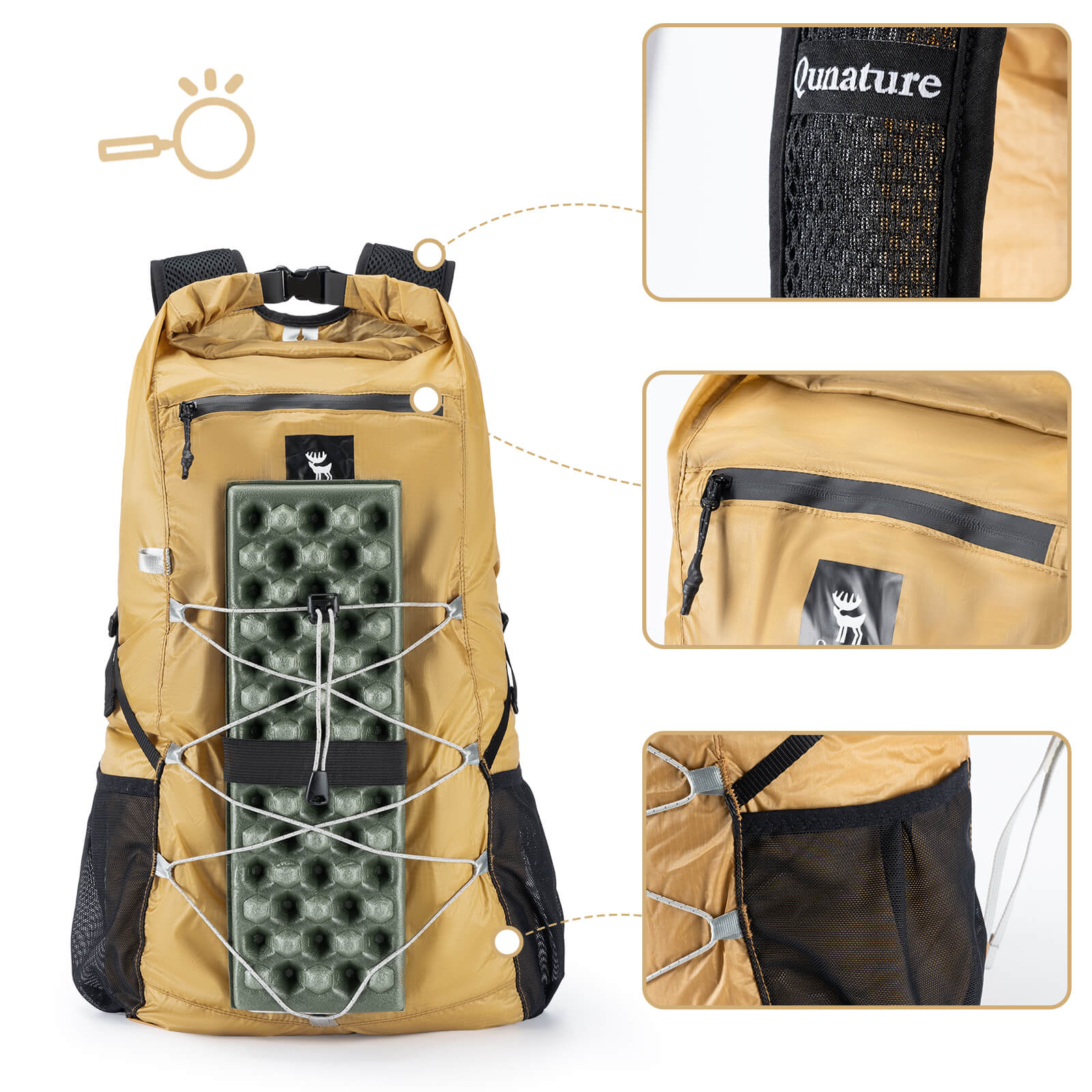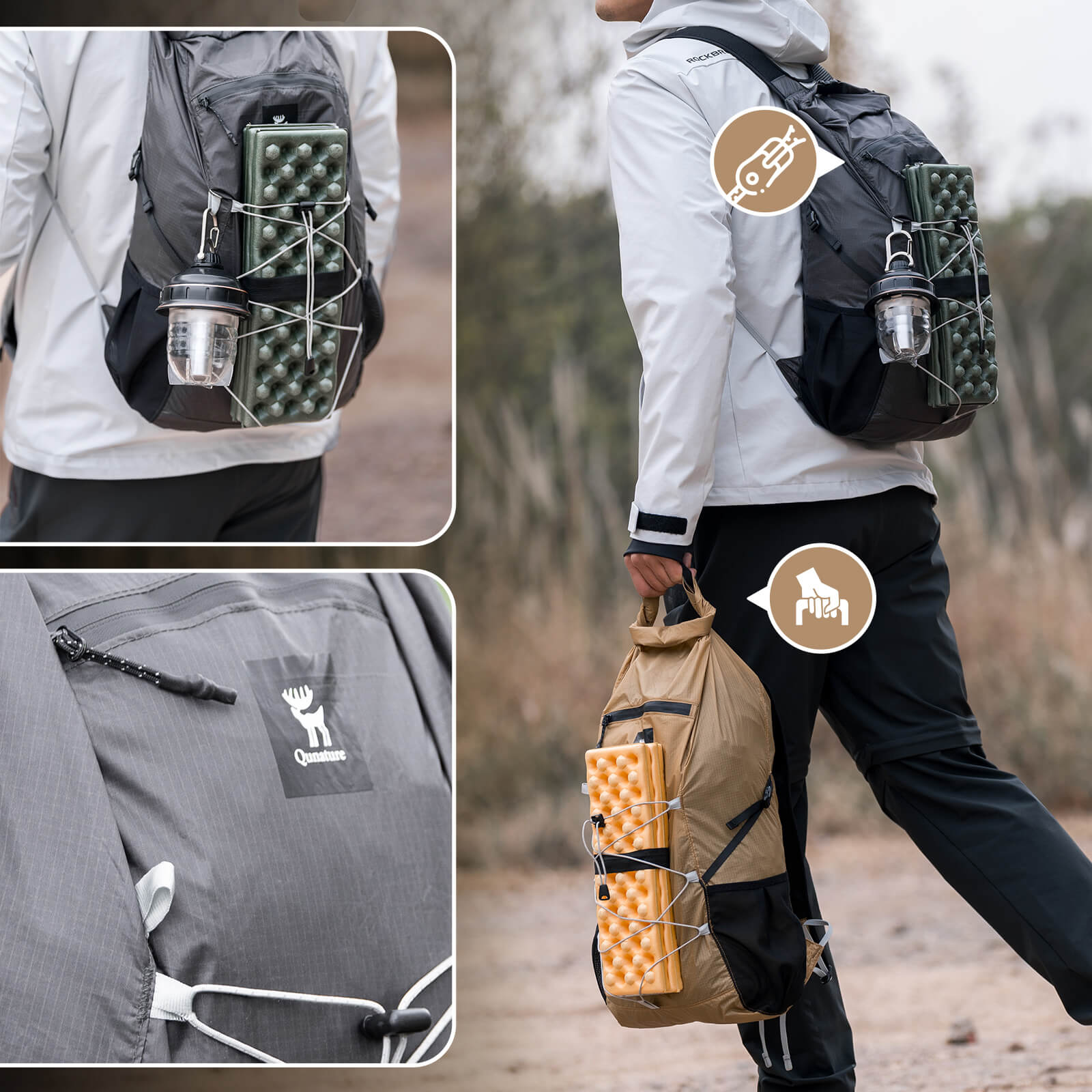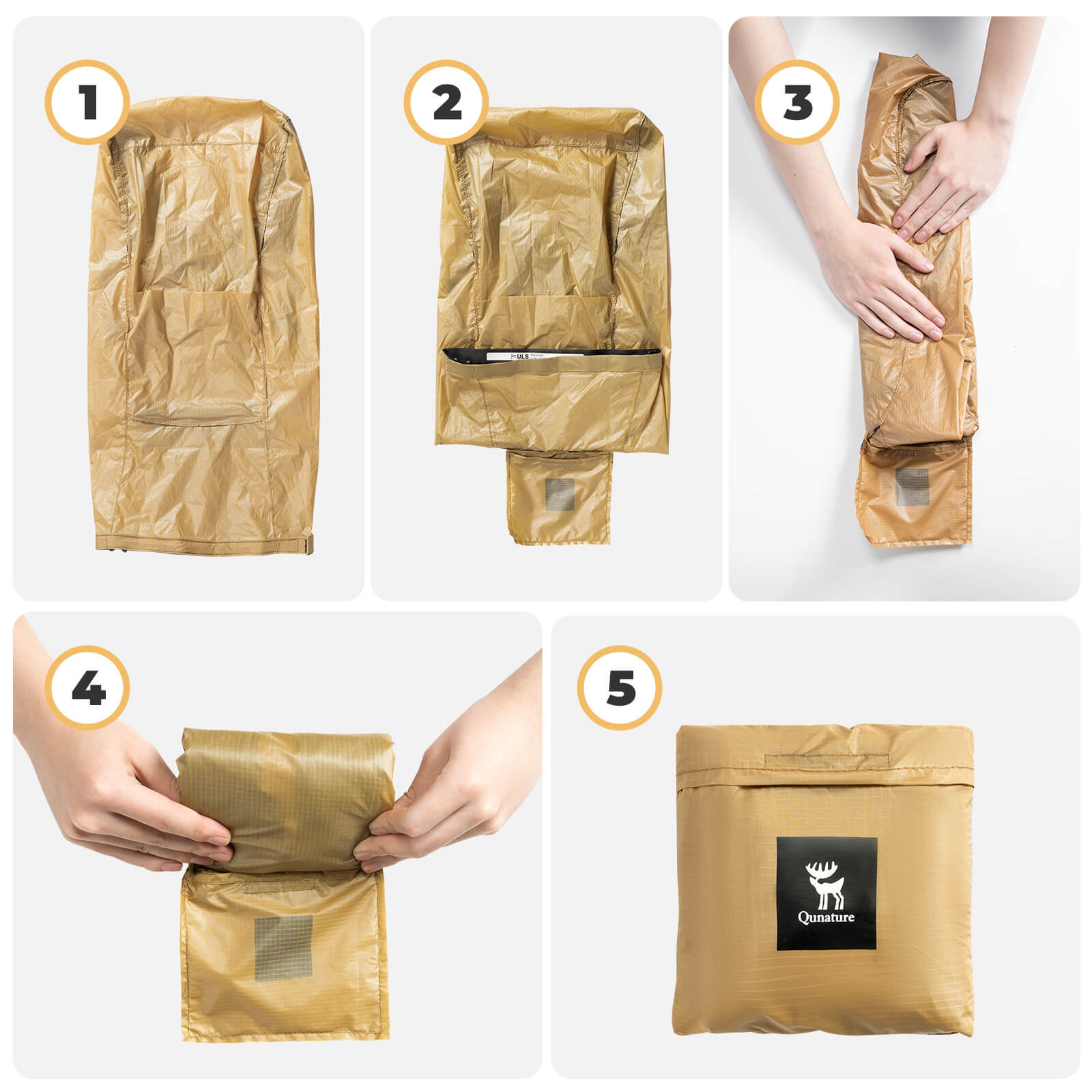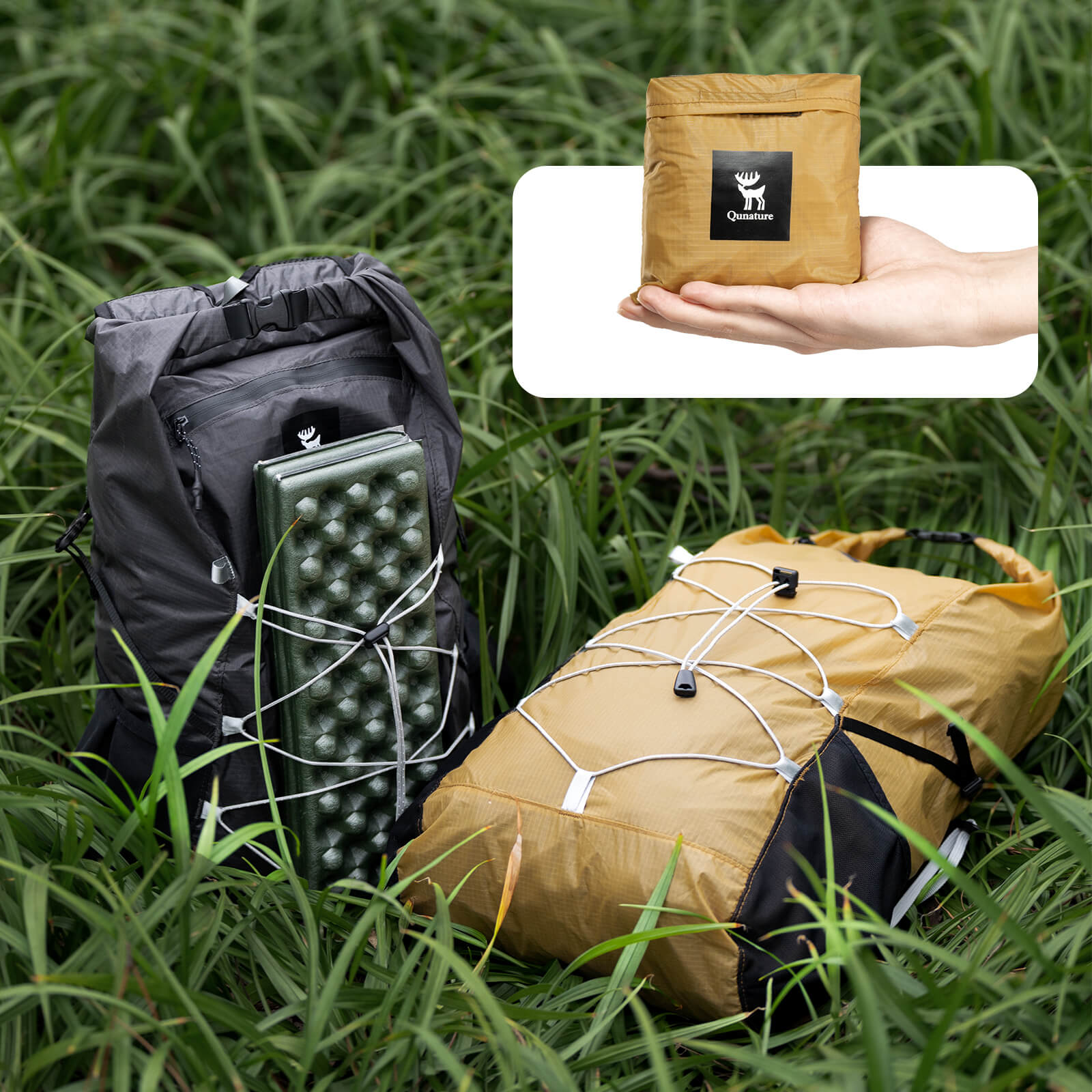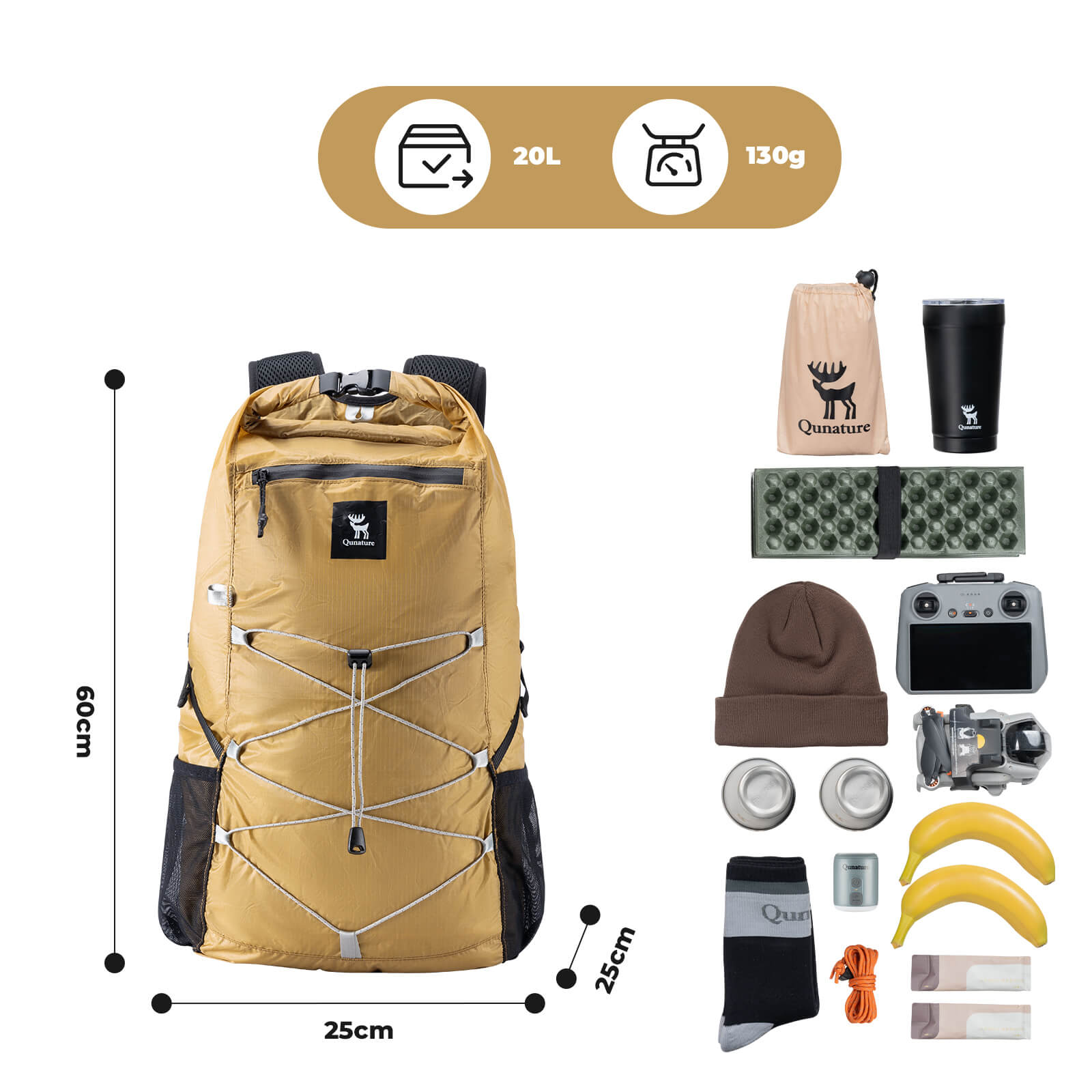 Kompakt faltbar, nur 130 g. Aus 30D silikonbeschichtetem Nylon – wasserabweisend, reißfest und robust. Bereit für jede Herausforderung unterwegs.